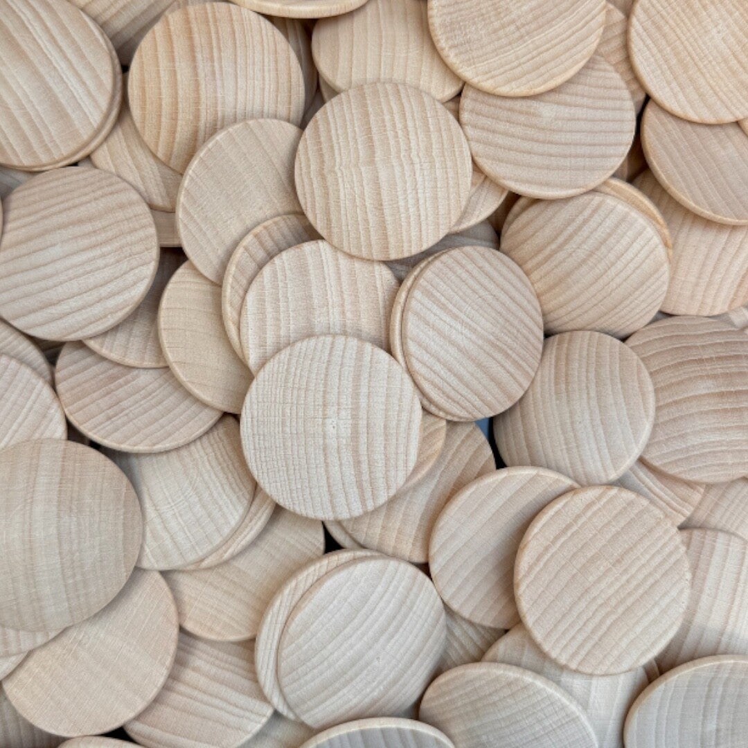 Een houten schijfje die aan één kant plat is, en aan de andere kant een lichte bolling heeft. Het schijfje is gemaakt van gebleekt beukenhout en voelt glad aan.